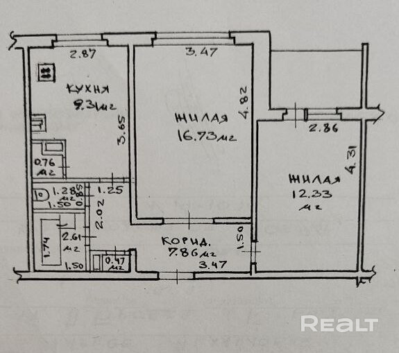 Общая площадь квартиры – 51.35м2, жилая площадь – 29.06м2 (2 комнаты: 16,73м2,  12,33м2 ), площадь кухни  с нишей - 10,07м2, .