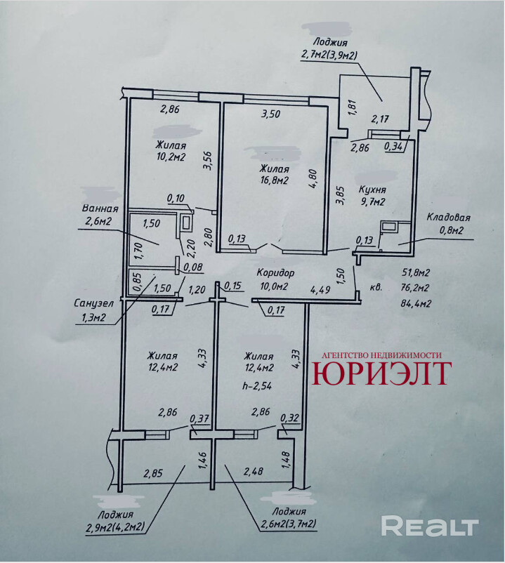 • Жилая площадь: 51.8 кв.м. (четыре изолированные комнаты: 16.8 / 12.4 / 12.4 / 10.2 кв.м.).