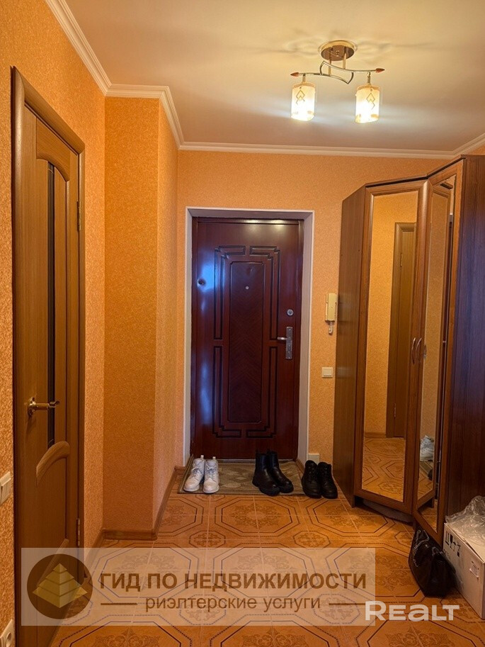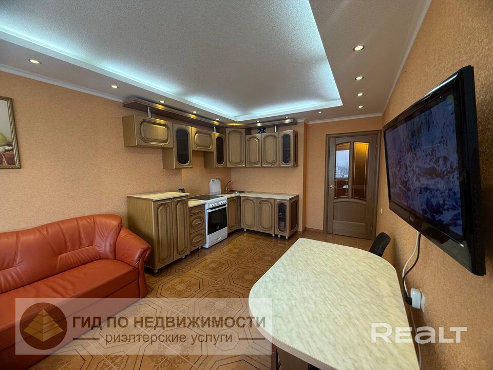 Продается однокомнатная квартира в самом востребованном районе г. Гомеля по улице Головацкого, д. 105А. Квартира находится в монолитном восемнадцатиэтажном доме на 17 этаже. Общая площадь по СНБ – 53 кв.м., жилая – 20 кв.м., кухня – 17 кв.м. Год постройки – 2008. Высота потолка – 2.5 м. Стены наружные – блоки из ячеистого бетона; внутренние – кирпичные, ячеистые блоки; перекрытия – монолитные ж/б. Раздельный санузел. Выход на лоджию возможен через кухню и комнату. В квартире выполнен ремонт из качественных материалов. На полу плитка и ламинат. Окна ПВХ. Прекрасный панорамный вид из окна. Большая часть мебели останется при продаже. В доме 2 лифта. Парковка для автомобилей.