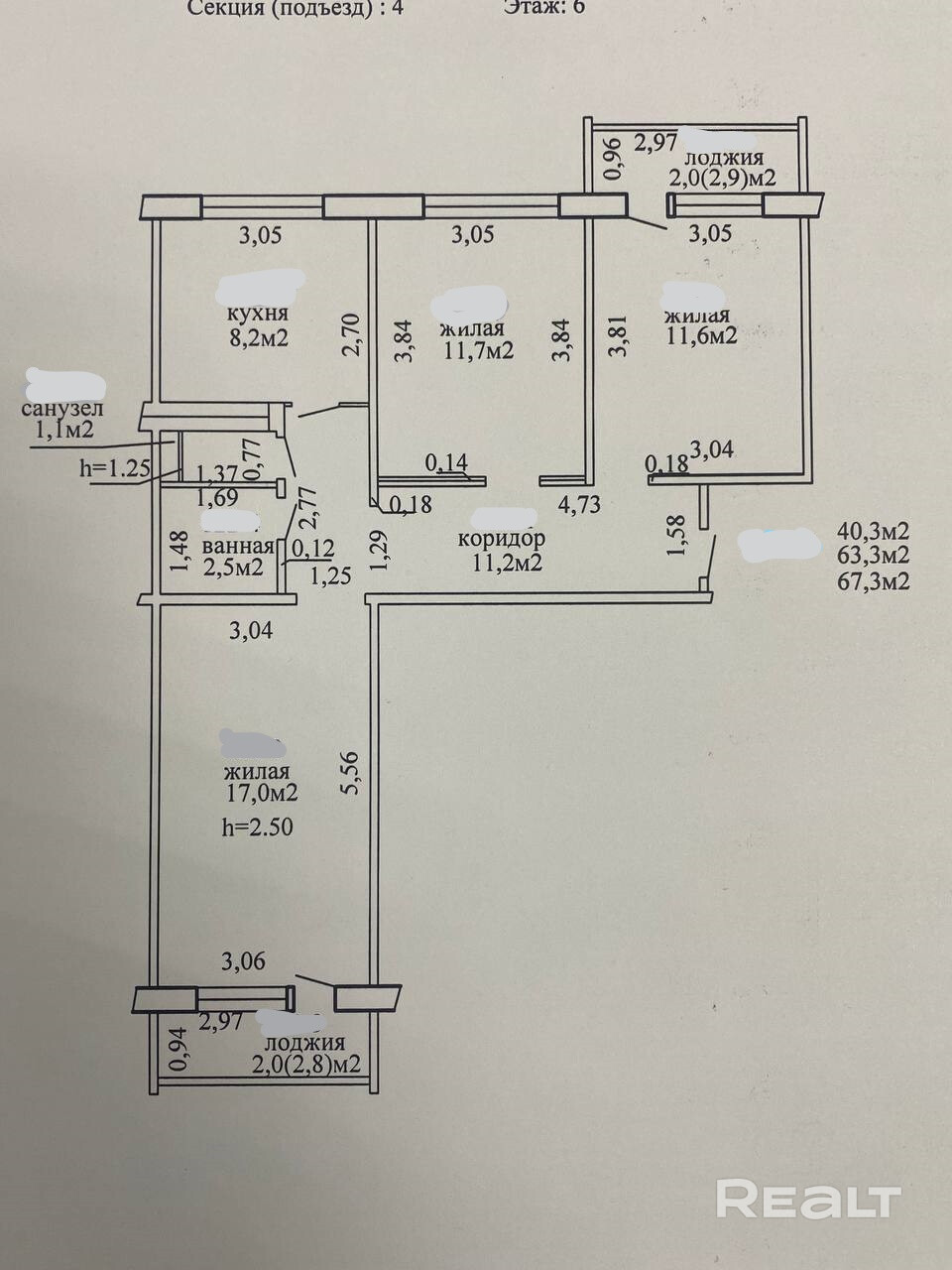 Технические характеристики квартиры: площадь по СНБ (включая две лоджии)-67,3 кв.м., общая 63,3 кв.м., жилая-40,3 кв.м., кухня-8,2 кв.м. Все комнаты изолированные, санузел раздельный, 2 лоджии из жилых комнат. Высота потолка-2,5 метра.
