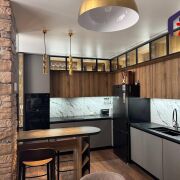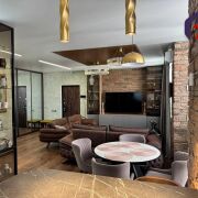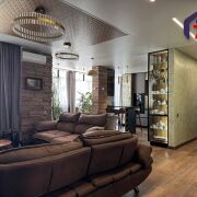 - Гостиная дополнена мягкой мебелью-трансформером из замши (Турция) и стильной барной зоной со стульями ручной работы.