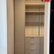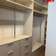 - В спальне предусмотрена гардеробная с продуманными системами хранения и встроенной мебелью.