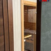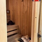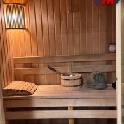 - Отдельное преимущество — собственная СПА-зона: парная из ольхи с печью «Harvia» (сухая и мокрая баня) и душевая с «ведром омоложения».