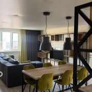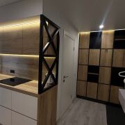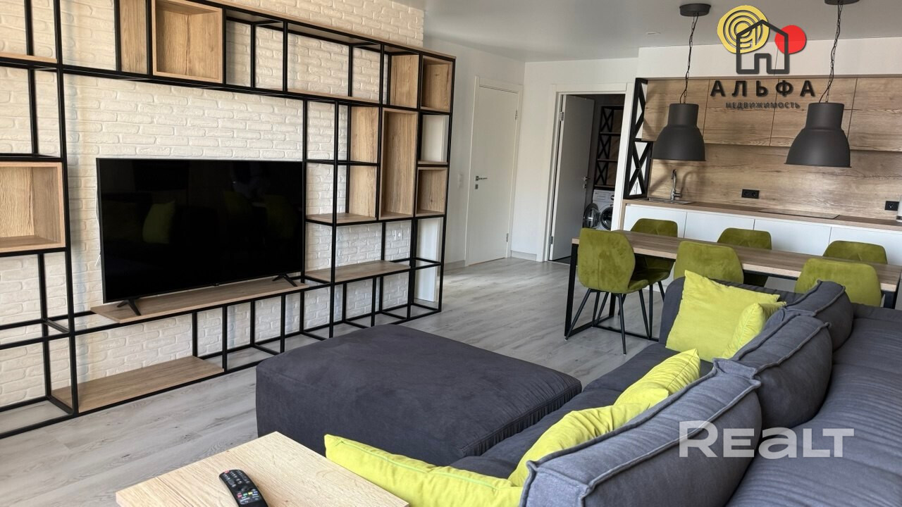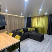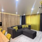 Каждая комната квартиры наполнена уникальной атмосферой благодаря разнообразным сценариям освещения. Это позволяет создать нужное настроение в любое время суток. Современная кухня-гостиная. является настоящим воплощением комфорта и функциональности. Кухня оборудована встроенной премиальной техникой, включая холодильник, варочную панель, духовой шкаф, посудомоечную машину и СВЧ-печь. Отдельная столовая зона со столом идеально подходит для семейных ужинов и встреч с друзьями, создавая атмосферу уюта и тепла. Зона гостиной оборудована большим диваном и телевизором, что делает её идеальным местом для отдыха и развлечений. Квартира располагает множеством мест хранения, что позволяет поддерживать порядок и организованность. В спальне находится большая двуспальная кровать, а также стильный комод и тумба, что создает атмосферу уюта и спокойствия. Кабинет, где установлен стол и просторный диван, также имеет выход на комфортную лоджию, что делает его идеальным местом для работы или отдыха. Санузел оформлен в современном стиле с использованием высококачественной плитки, что подчеркивает общий уровень комфорта и стиля квартиры.