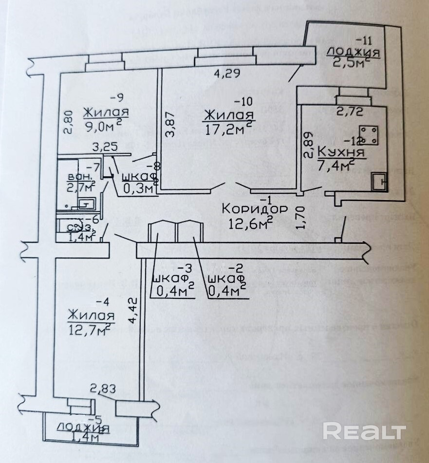 Квартира расположена на 7-м этаже 10-ти этажного кирпичного дома 1990г.п. Общая площадь квартиры 64.1кв.м. по СНБ. Жилая площадь 38.9 кв.м. Кухня 7.4 кв.м. Квартира состоит из просторного зала, двух  уютных комнат, просторного и длинного коридора, кухни и раздельного санузла. Также в квартире имеются две просторные, утеплённые лоджии. Планировка квартиры соответствует техническому паспорту. В квартире установлены окна ПВХ, лоджии застеклены, хорошая входная дверь.