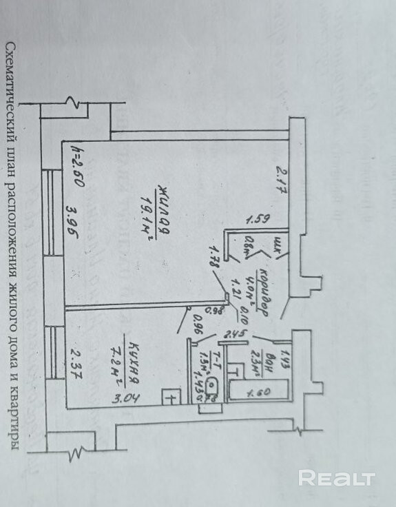 Общая площадь 34,7 м2, жилая площадь 19,1м2, кухня 7,2м2.
