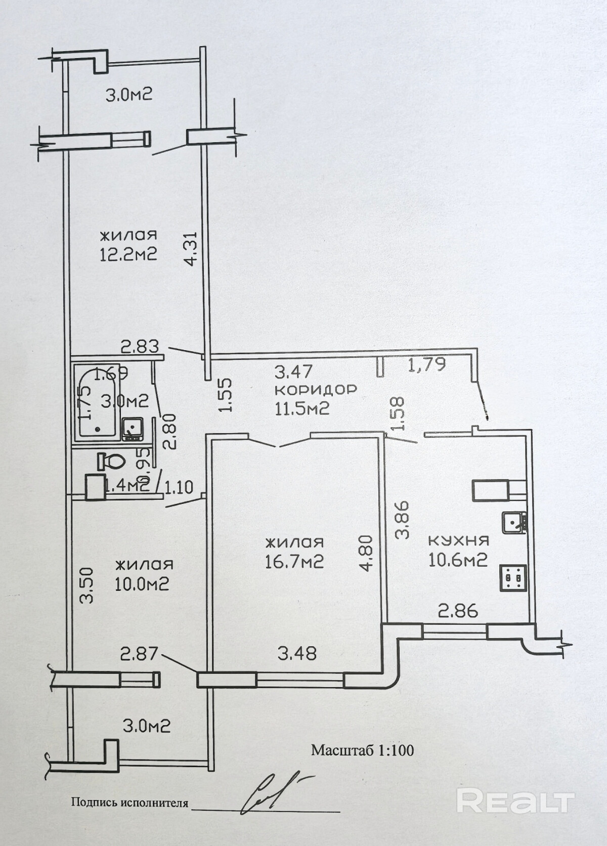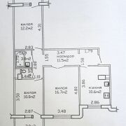 Удобная планировка с просторными комнатами (общая площадь 71.4 м2, жилая – 38.9 м2) с высокими потолками (2.63 м)