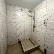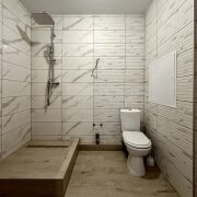– просторный  совмещенный санузел отделан стильной, качественной плиткой, оборудованы практичная душевая, выводы под стиральную машину и  раковину;