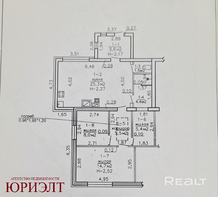 Квартира состоит из трёх изолированных комнат (8м2, 5,4м2, 14,7м2), большой кухни 25,3 м2, раздельного санузла, веранды. Окна ПВХ, пол дощатый.