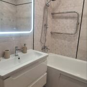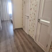 Жилая площадь 43,7 м2, кухня 12,1 м2. Окна все ПВХ, на полу ламинат, плитка керамическая, входная дверь металлическая. В кухне установлена система очистки воды. Индивидуальные приборы учёта воды, газа, электро- и теплоснабжения.