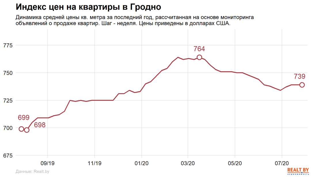 Средняя цена в объявлениях о продаже квартир в Гродно не изменилась и составила 739 $/м2.
