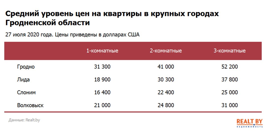 Мониторинг цен предложения квартир в Гродно и городах Гродненской области за 20−27 июля 2020 года
