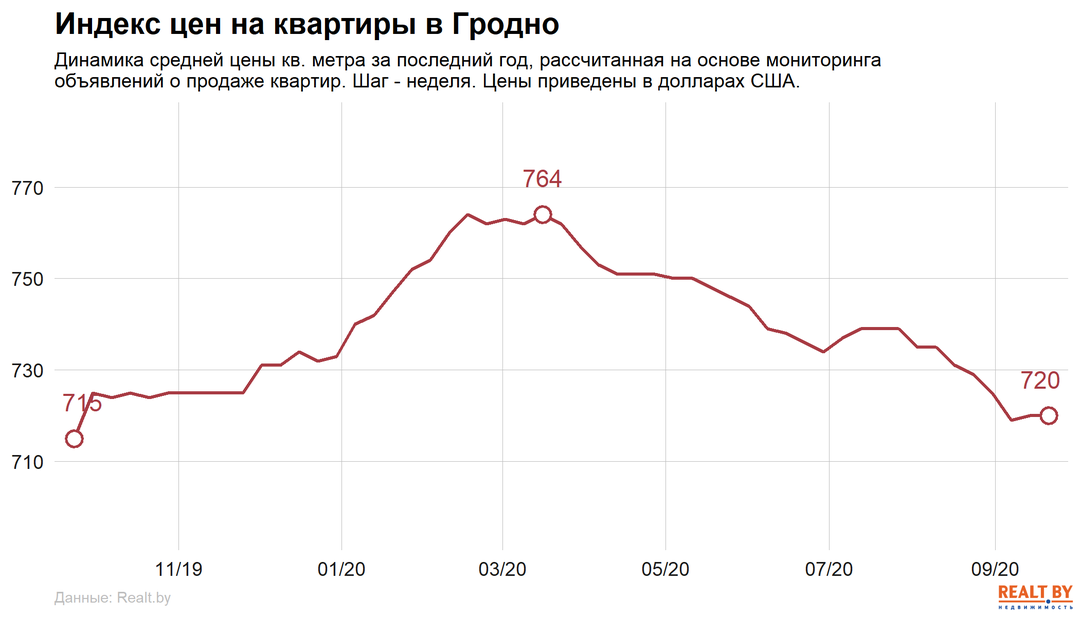 Средняя цена в объявлениях о продаже квартир в Гродно не изменилась и составила 720 $/м2.