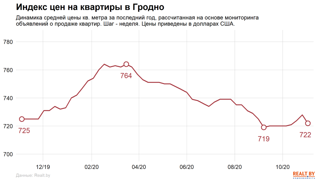Средняя цена в объявлениях о продаже квартир в Гродно снизилась на 0.8% и составила 722 $/м2.