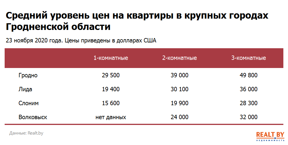 Мониторинг цен предложения квартир в Гродно и городах Гродненской области за 16−23 ноября 2020 года