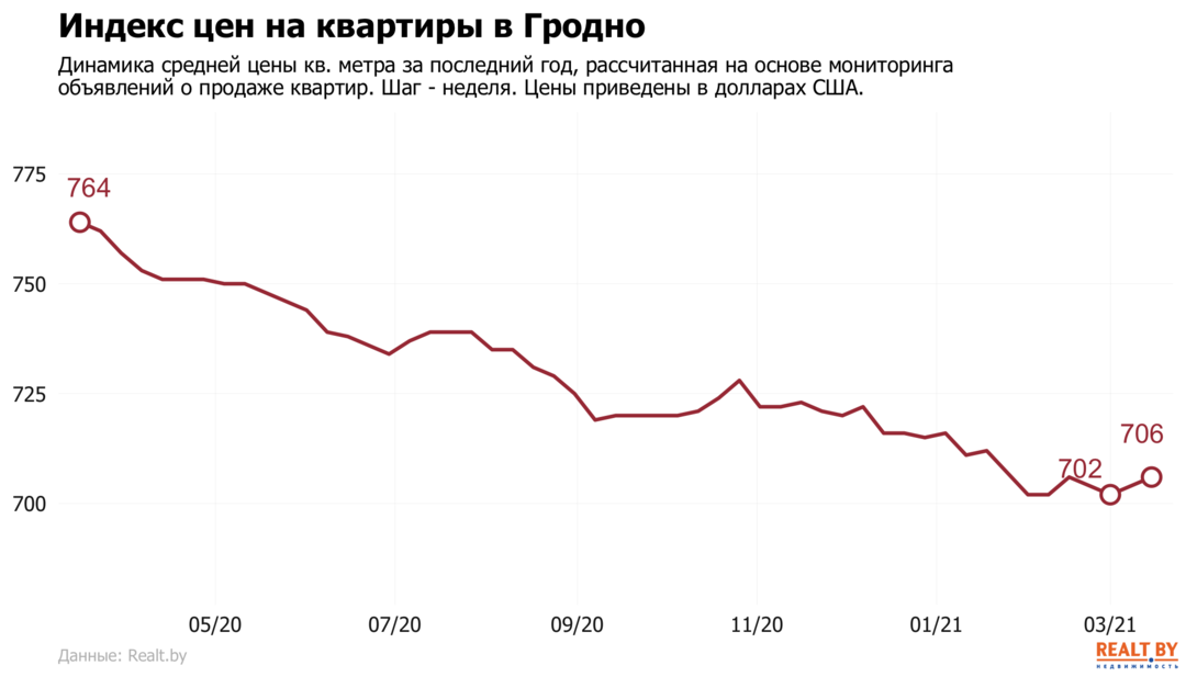 Средняя цена в объявлениях о продаже квартир в Гродно выросла на 0.3% и составила 706 $/м2.