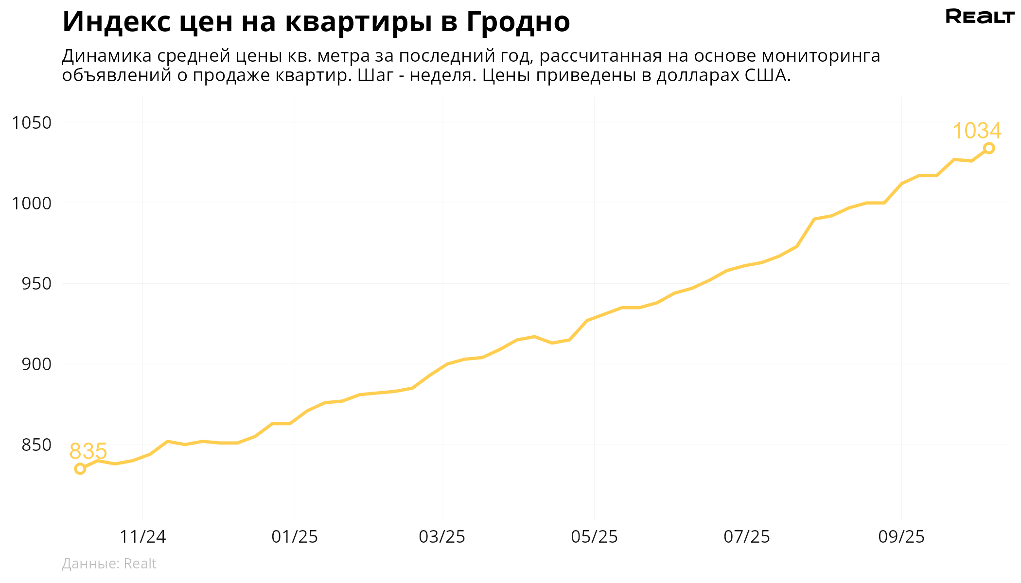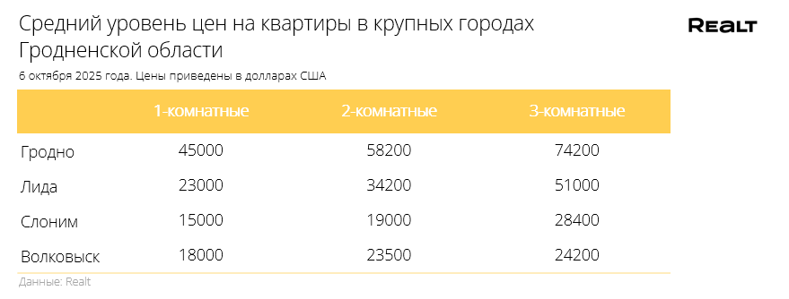 76За неделю, c 29 сентября по 6 октября 2025 года, средняя цена в объявлениях о продаже квартир в Гродно выросла на 0.8% и составила 1034 $/м2. При этом количество квартир в продаже увеличилось на 0.4%. Что еще произошло на рынке жилья крупнейших городов Гродненской области за семь дней — в материале.