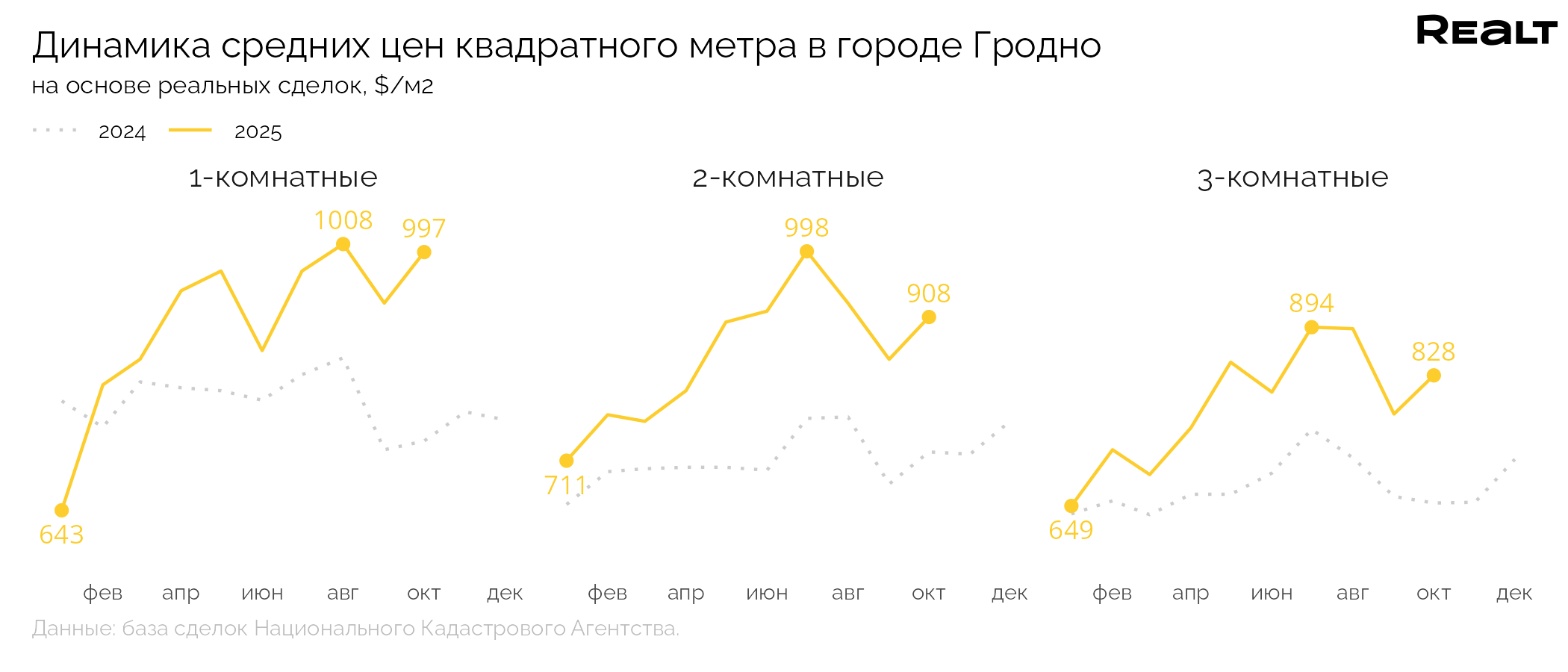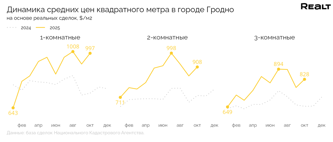 По данным сделок средняя цена квадратного метра 1-комнатных квартир, которые на данный момент продаются в среднем по 997 $/м2, увеличилась на 7.6%. Средняя стоимость 2-комнатных квартир в Гродно составляет 908 $/м2 (+6.8% за месяц). 3-комнатные квартиры продавали в среднем за 828 $/м2 (+6.8% за месяц).