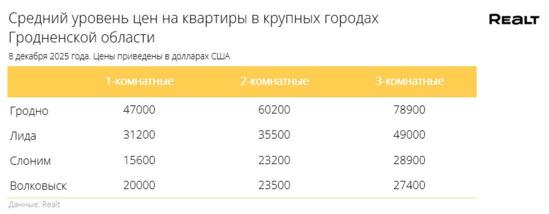 139За неделю, с 1 по 8 декабря 2025 года, средняя цена в объявлениях о продаже квартир в Гродно выросла на 0.1% и составила 1078 $/м2. При этом количество квартир в продаже уменьшилось на 3.3%. Что еще произошло на рынке жилья крупнейших городов Гродненской области за семь дней — в материале.