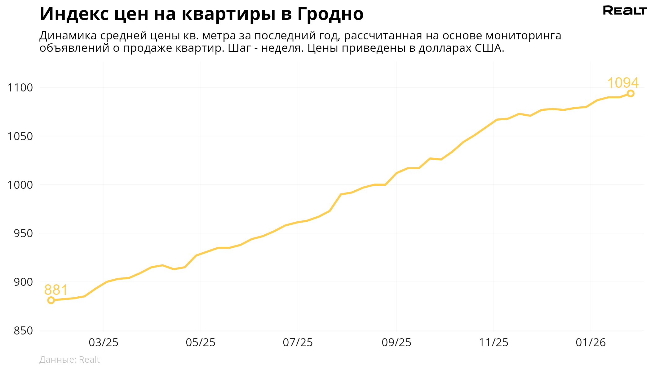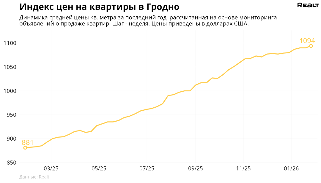 187За неделю, с 19 по 26 января 2026 года, средняя цена в объявлениях о продаже квартир в Гродно выросла на 0.4% и составила 1094 $/м2. При этом количество квартир в продаже увеличилось на 1.5%. Что еще произошло на рынке жилья крупнейших городов Гродненской области за семь дней — в материале.