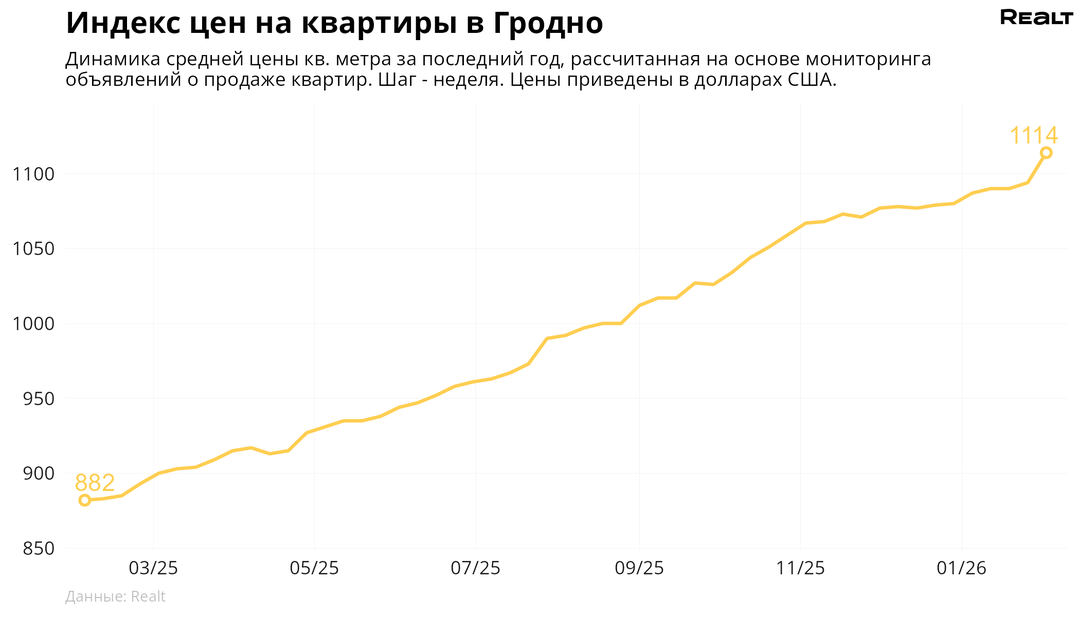 79За неделю, c 26 января по 2 февраля 2026 года, средняя цена в объявлениях о продаже квартир в Гродно выросла на 1.8% и составила 1114 $/м2. При этом количество квартир в продаже увеличилось на 0.8%. Что еще произошло на рынке жилья крупнейших городов Гродненской области за семь дней — в материале.