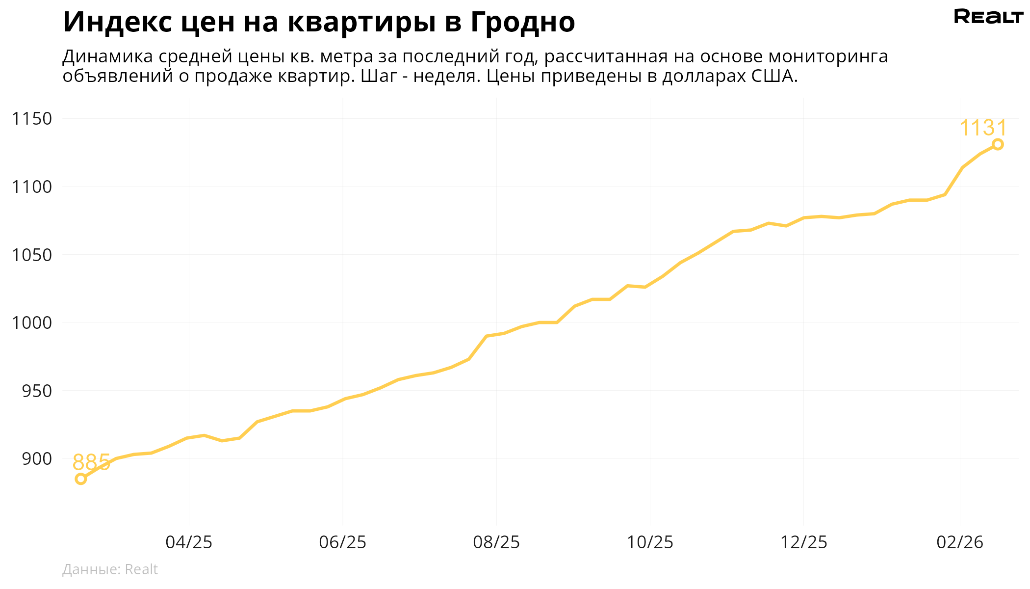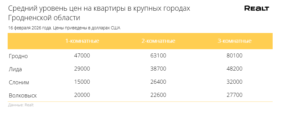За год средняя стоимость квадрата увеличилась на 28%. Что произошло со стоимостью квартир в Гродно и области за 9−15 февраля 2026 года