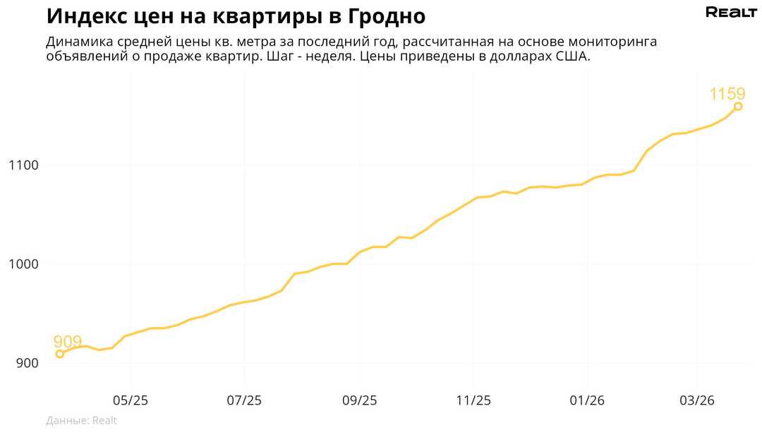 133За неделю, с 16 по 23 марта 2026 года, средняя цена в объявлениях о продаже квартир в Гродно выросла на 1% и составила 1159 $/м2. При этом количество квартир в продаже увеличилось на 4.9%. Что еще произошло на рынке жилья крупнейших городов Гродненской области за семь дней — в материале.