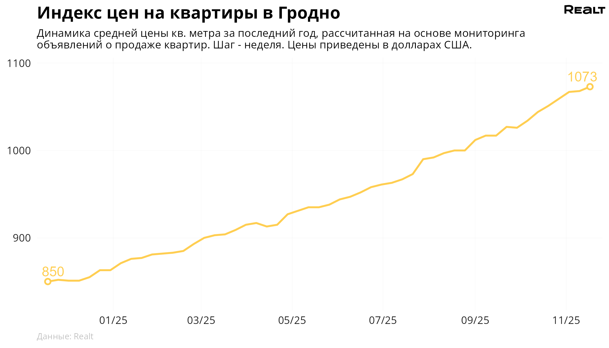 208За неделю, с 10 по 17 ноября 2025 года, средняя цена в объявлениях о продаже квартир в Гродно выросла на 0.5% и составила 1073 $/м2. При этом количество квартир в продаже увеличилось на 1.3%. Что еще произошло на рынке жилья крупнейших городов Гродненской области за семь дней — в материале.