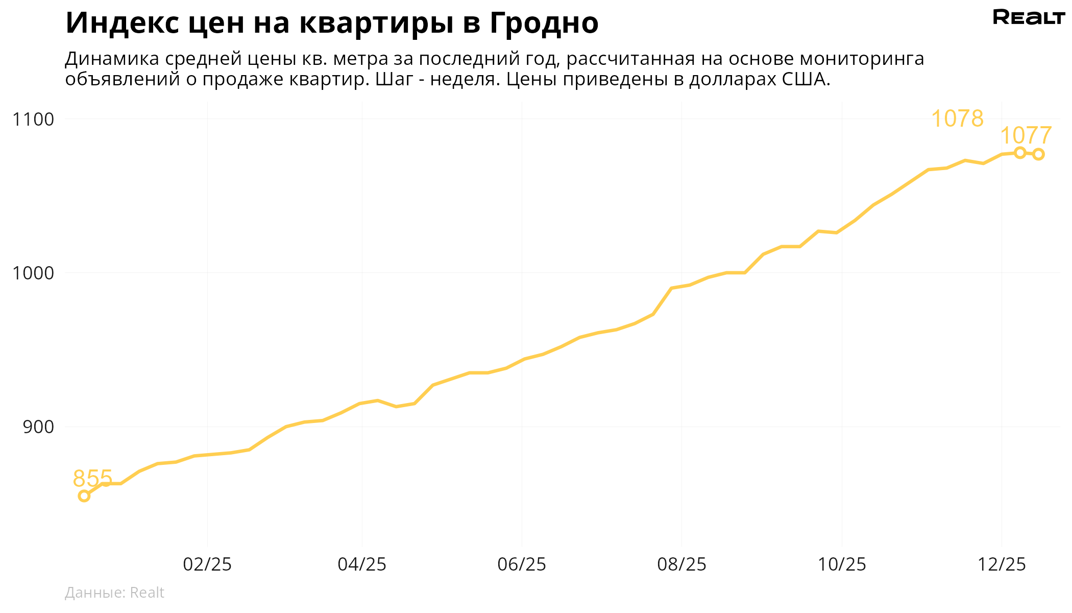 108За неделю, с 8 по 15 декабря 2025 года, средняя цена в объявлениях о продаже квартир в Гродно снизилась на 0.1% и составила 1077 $/м2. При этом количество квартир в продаже уменьшилось на 2.2%. Что еще произошло на рынке жилья крупнейших городов Гродненской области за семь дней — в материале.