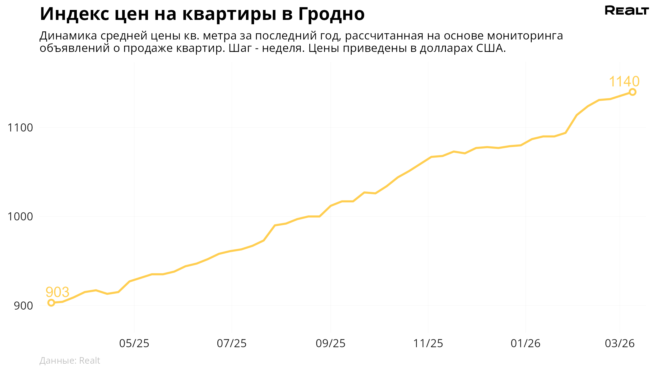 133За неделю, с 2 по 9 марта 2026 года, средняя цена в объявлениях о продаже квартир в Гродно выросла на 0.4% и составила 1140 $/м2. При этом количество квартир в продаже увеличилось на 0.2%. Что еще произошло на рынке жилья крупнейших городов Гродненской области за семь дней — в материале.