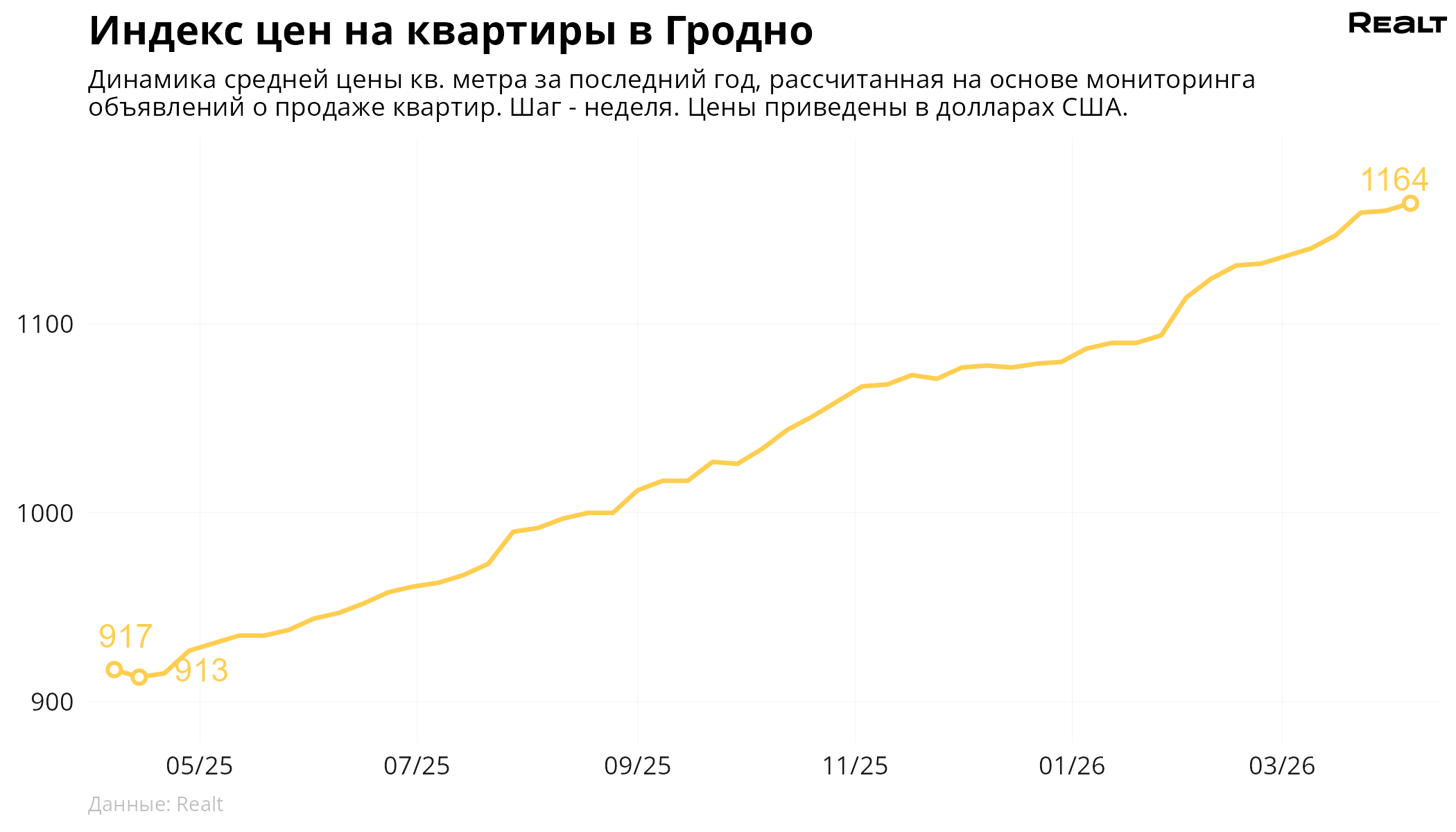 124За неделю, c 30 марта по 6 апреля 2026 года, средняя цена в объявлениях о продаже квартир в Гродно выросла на 0.3% и составила 1164 $/м2. При этом количество квартир в продаже увеличилось на 2.3%. Что еще произошло на рынке жилья крупнейших городов Гродненской области за семь дней — в материале.