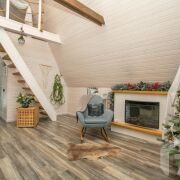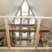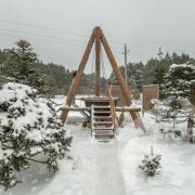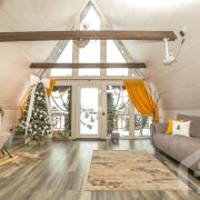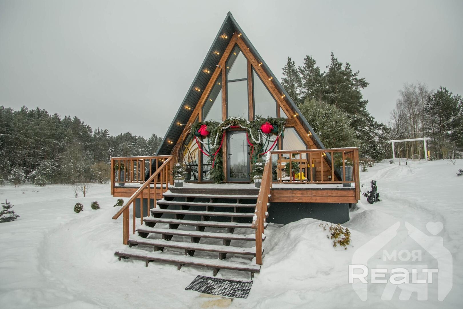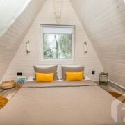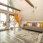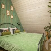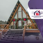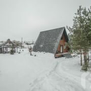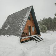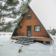 -Основной дом выполнен в формате A-frame - архитектуре, где форма работает на ощущение уюта, света и близости к природе. Общая площадь 59 кв.м. с двумя террасами 26 метров. Высокий фасад с панорамным остеклением наполняет пространство естественным светом и визуально стирает границу между интерьером и окружающим лесом. Конструкция дома продумана и добротна, с аккуратной террасой и удобным входом, который сразу задаёт атмосферу уединённого загородного отдыха.