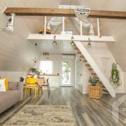-На первом уровне расположены гостиная и кухня, на втором - уютная спальня. В интерьере использована стильная мебель ручной работы, каждая деталь продумана и собрана в цельный дизайнерский образ.