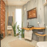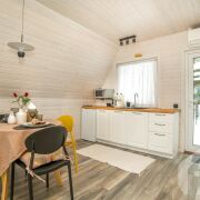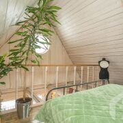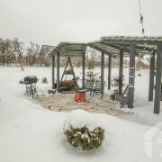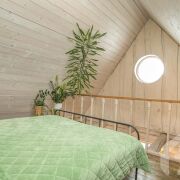 -Второй дом выполнен в стиле современной белорусской избы и органично дополняет основной. Общая площадь 45 кв.м., площадь террасы 24 кв.м. Он также двухэтажный: гостиная с кухней на первом уровне и уютная спальня на втором. В доме оборудованы душевая и санузел, рядом с домом отдельный чан для отдыха. Это полноценное автономное пространство, которое можно использовать для гостей или сдачи в аренду.