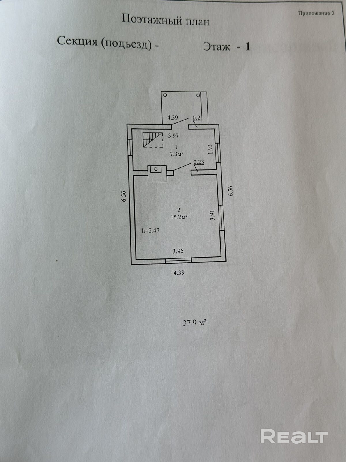 Общая площадь дома - 37.9 м2, две жилые комнаты, гостиная.