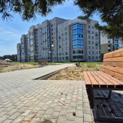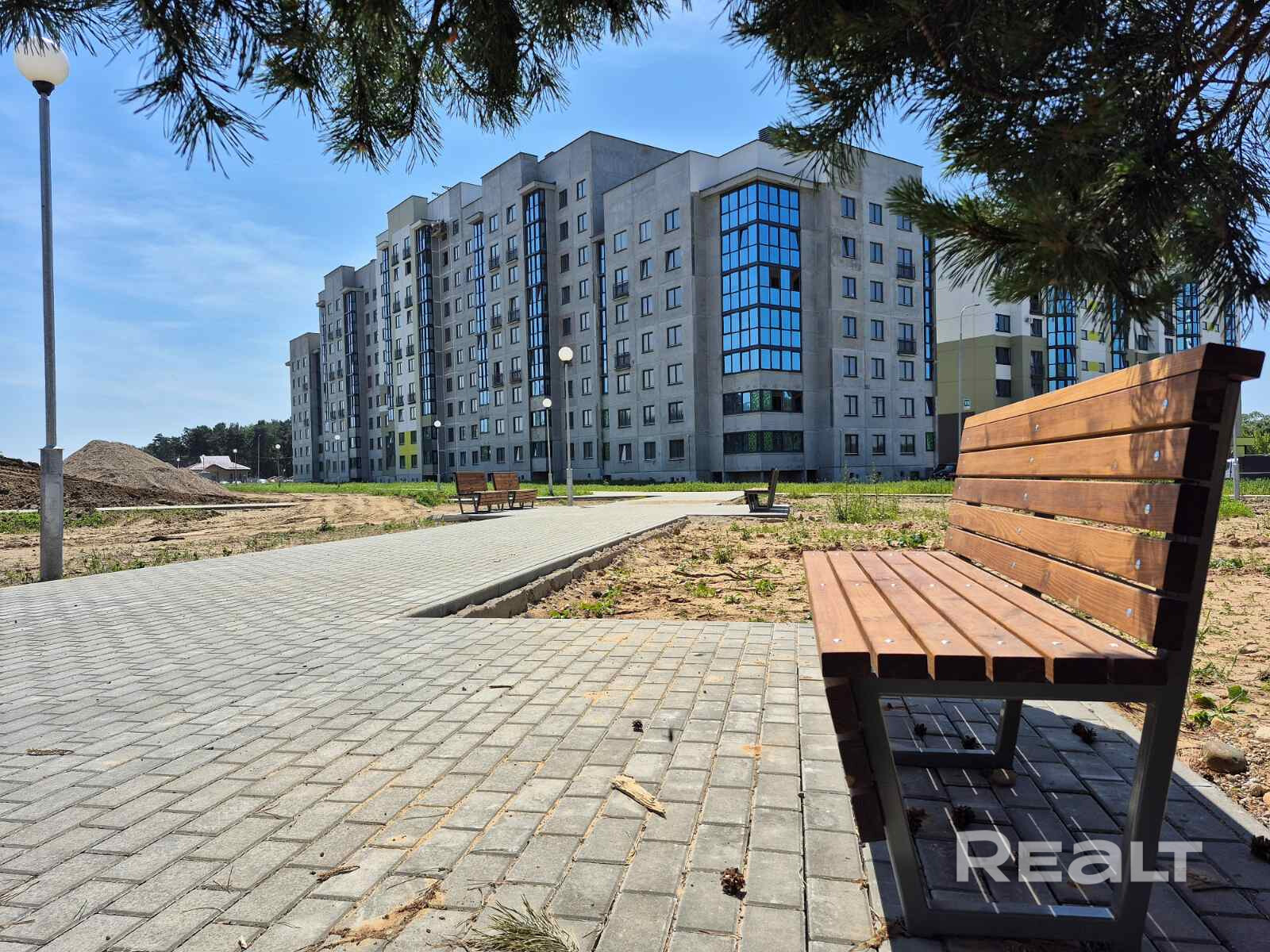 Во дворе современная детская площадка с мягким покрытием. Уютные прогулочные дорожки. Сосны придают живописную атмосферу и экологичность. Район еще облагораживается. Место очень красивое!