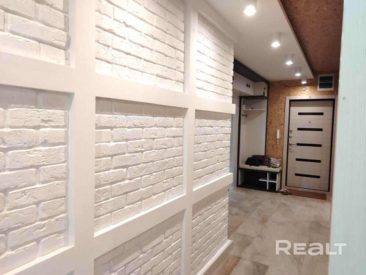 Квартира очень теплая и светлая (окна на 2 стороны дома), с дизайнерским качественным ремонтом, продуманным до мелочей. Стены — декоративная штукатурка и кирпич, окраска, обои; входные
