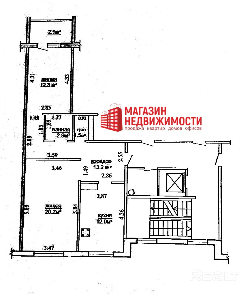 Общая площадь квартиры- 64,2 кв.м., жилые комнаты: 20,2 кв.м., 12,3 кв.м., просторная кухня- 12 кв.м.