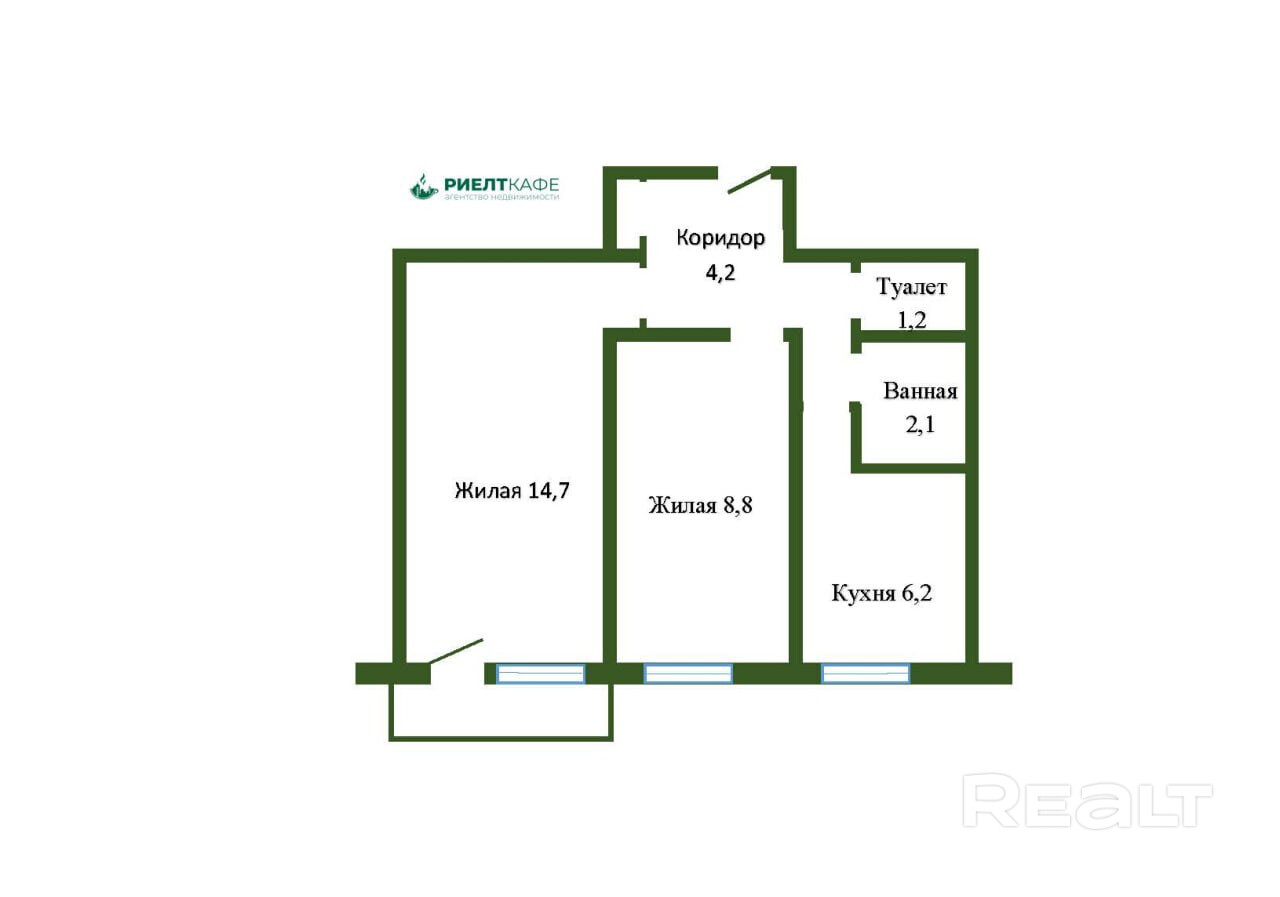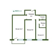 Общая площадь-38,3 м2, две изолированные комнаты – 8,8 м2 и 14,7 м2. Кухня 6,2 м2. Застекленный балкон. Санузел раздельный: ванная 2,1 м2, туалет 1,2 м2.