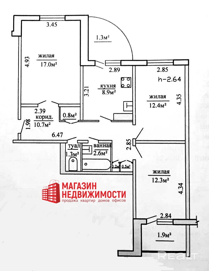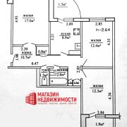 Общая площадь квартиры по СНБ- 79,9 кв.м. Общая площадь жилого помещения- 66,7 кв.м. Жилые комнаты: 17,0; 12,4; 12,3 кв.м., кухня- 8,9 кв.м., ванная- 2,6 кв.м., туалет- 1,3 кв.м, балкон- 1,3 кв.м., лоджия- 1,9 кв.м., кладовые- 0,8; 0,7 кв.м., коридор- 10,7 кв.м.