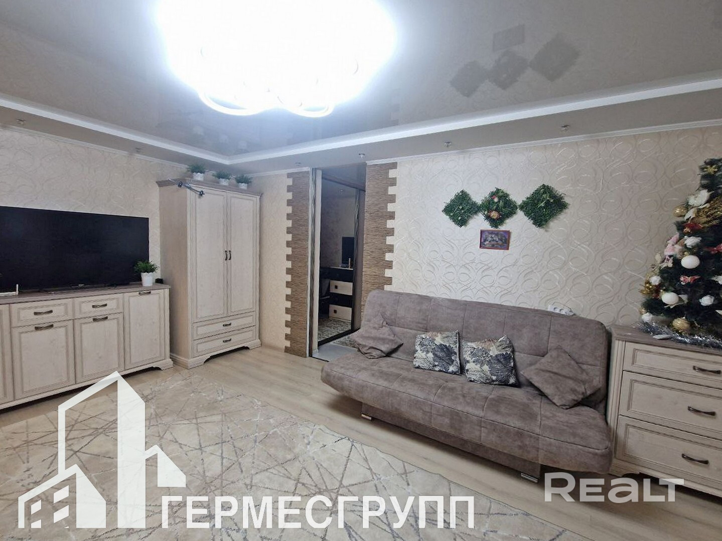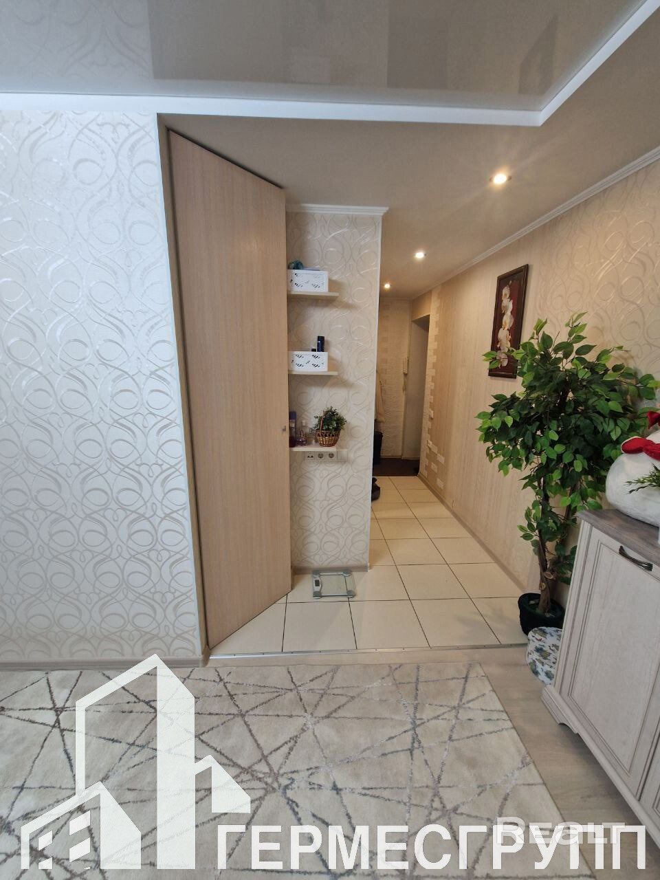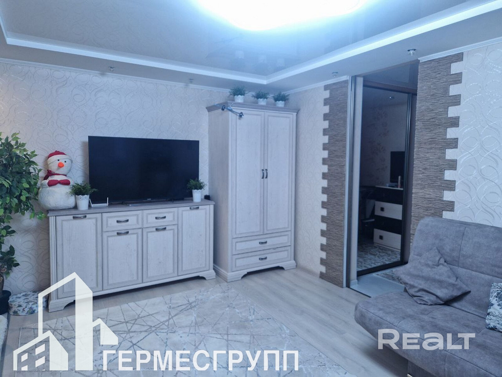 В квартире сделан качественный  ремонт : уложен ламинат  и плитка на полу, на стенах оклеены обои и декоративный камень. В квартире на потолке-  натяжной потолок.