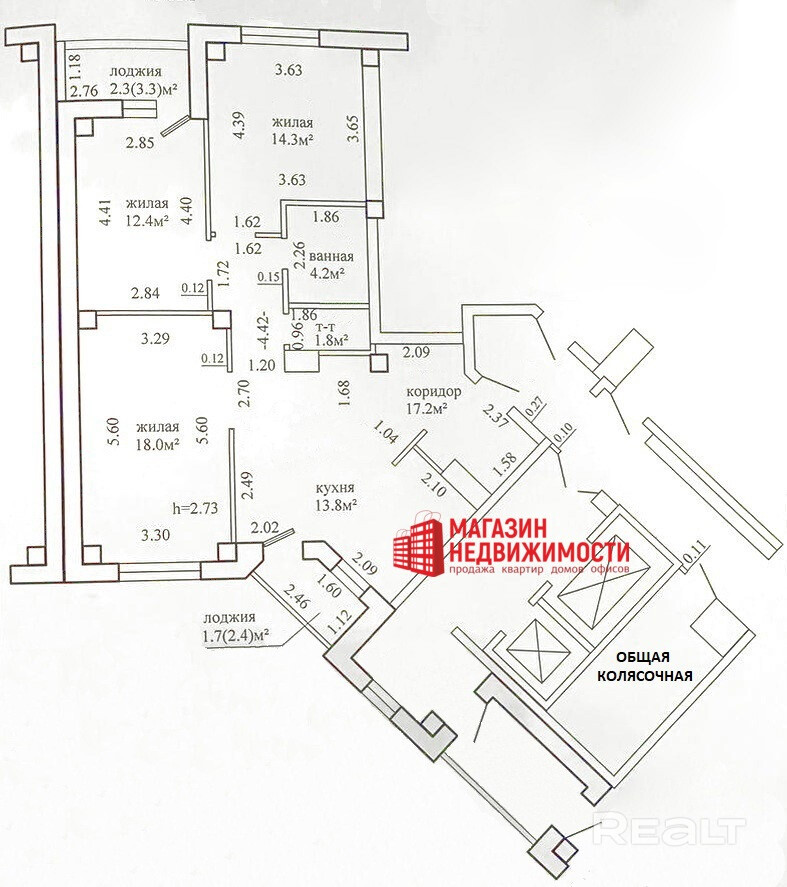 Общая площадь по СНБ- 85,7 кв.м. Общая площадь жилого помещения- 81,7 кв.м. Жилая площадь квартиры- 44,7 кв.м. в которую входят три комнаты площадью: 18,0; 14,3; 12,4 кв.м., кухня- 13,8 кв.м., ванная- 4,2 кв.м., туалет- 1,8 кв.м., две лоджии- 3,3; 2,4 кв.м., коридор- 17,2 кв.м. На площадке имеется общая кладовая для хранения детских колясок и велосипедов.