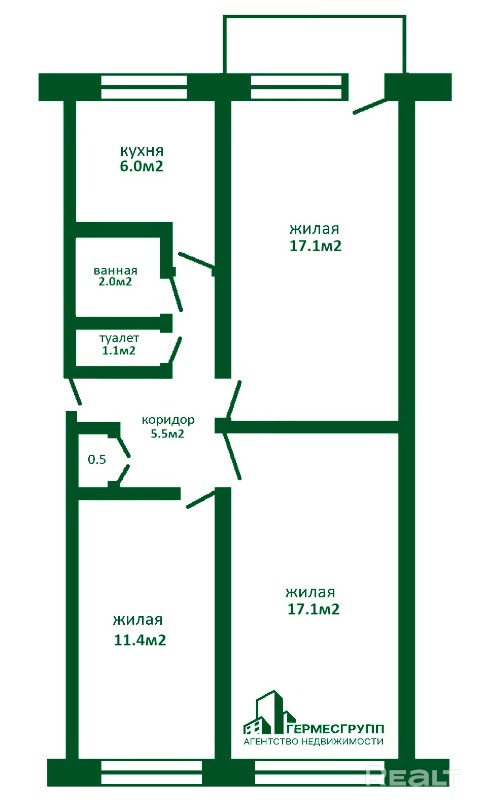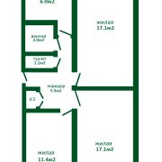 Все жилые комнаты изолированные, площадью: 17.1м2,17.1 м2 и 11.4 м2.