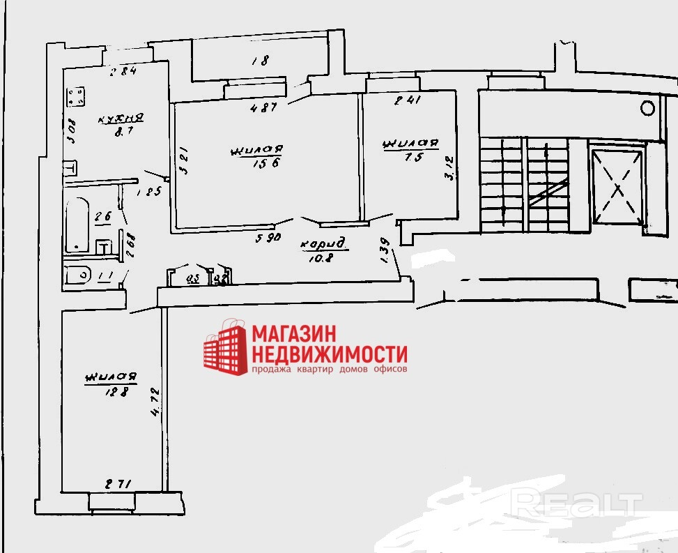 4 этаж 9-этажного дома 1982 года постройки, материал стен – кирпич. Общая площадь 59,8 кв.м., жилая 35.2 кв.м., кухня 78,7 кв.м.