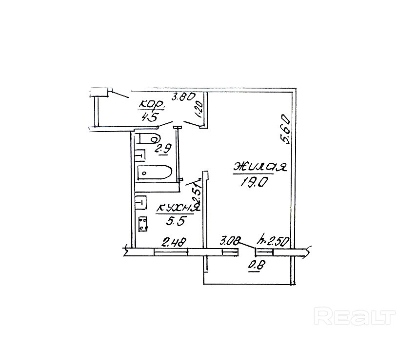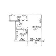Общая площадь – 31,9 кв. м., жилая – 19,0 кв. м., кухня – 5,5 кв. м.
