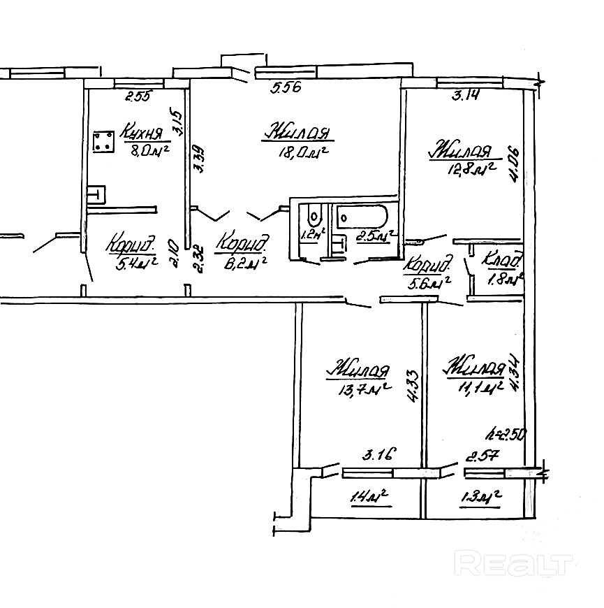 Общая площадь квартиры – 86,3 кв. м., жилая – 56,6 кв. м., кухня – 8 кв. м.