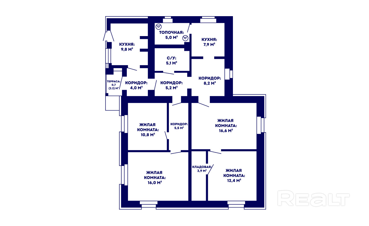 Характеристики квартиры: общая площадь по СНБ 111,1 кв. м, общая площадь - 110,4 кв. м, жилая - 59,7 кв. м. В квартире 4 жилые комнаты (12,4 с кладовой 3,9; 16,6; 16,0; 10,8 кв. м), 2 кухни (7,9 и 9,8 кв. м), совмещенный санузел (5,1 кв. м), столовая (8.2 кв. м), коридоры (5,5; 5,2; 4,0 кв. м), топочная (5,0 кв. м) и терраса (2,2 кв. м). Квартира отапливается от газового котла Лемакс, установленного в 2022 году. В квартире центральное отопление, газоснабжение, водоснабжение, канализация, электроснабжение. Реконструкция квартиры была сделана в 2014 году.