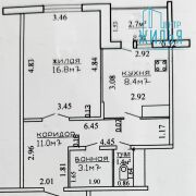 Общая площадь квартиры составляет 40,7 м.кв. (площадь по СНБ – 43,4 м.кв.), в т.ч.: жилая — 16,8 м.кв., кухня — 8,4 м.кв.