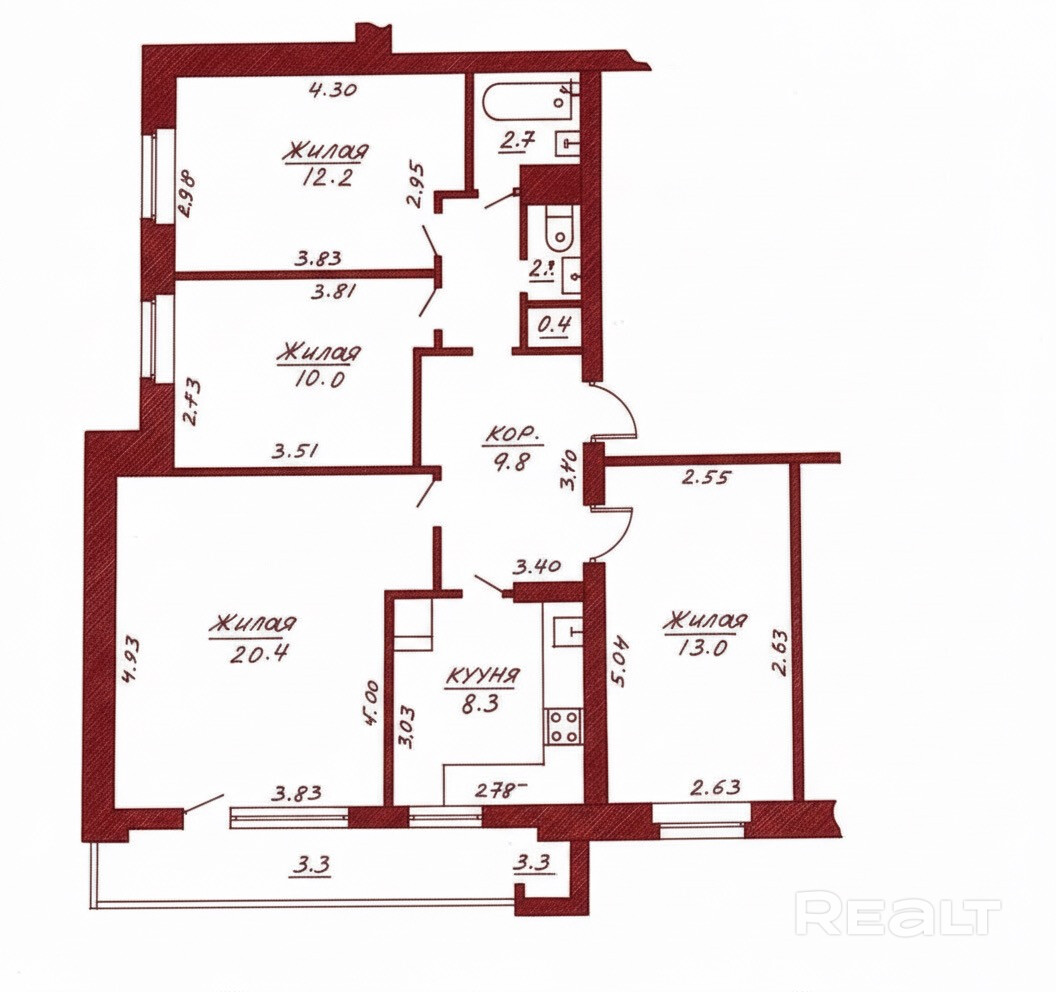 Общая площадь квартиры – 78 кв. м., жилая – 55,6 кв. м., кухня – 8,3 кв. м.