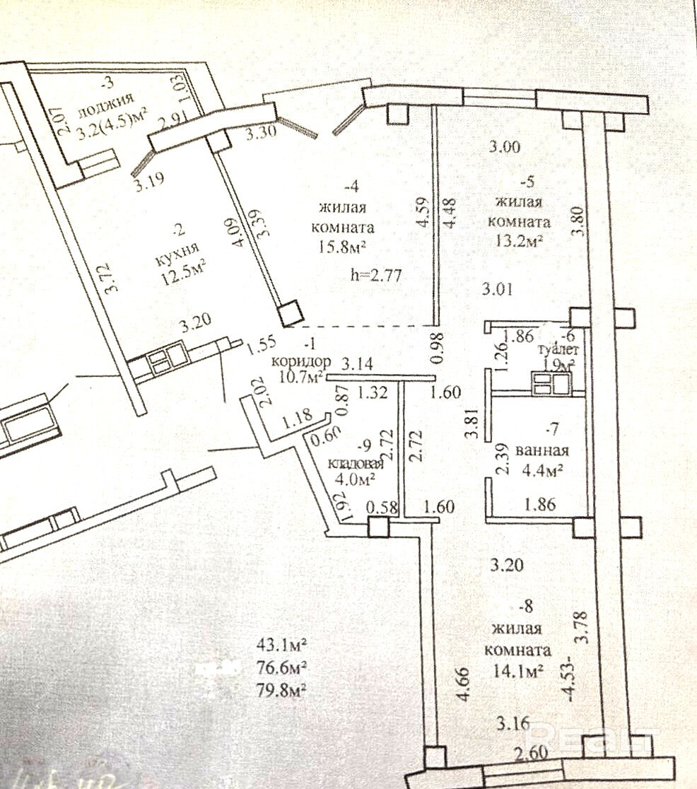 Площадь: СНБ 79,8 м2 , общая 76,6 м2, жилая 43,1 м2, кухня 12,5 м2, два сан. узла.